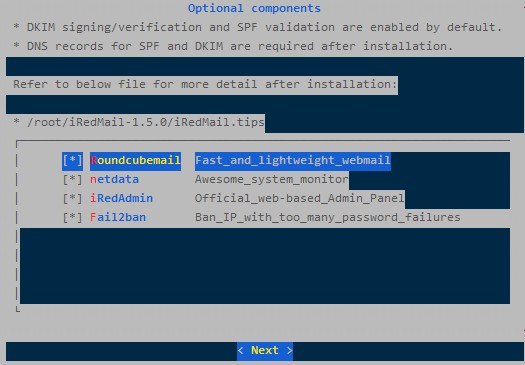 默认选择Roundcubemail + netdata + iRedAdmin + Fail2ban即可