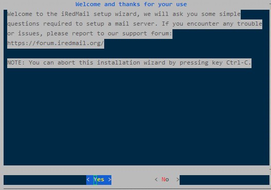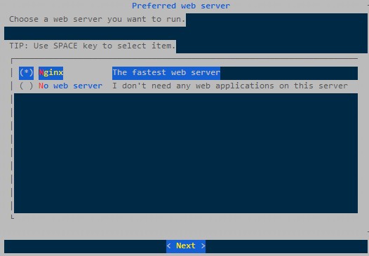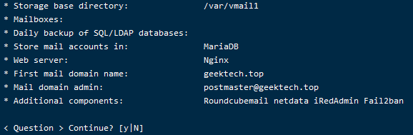 这里需要选择是否安装Web服务器。建议安装Nginx,服务器才可以正常的首发邮件,不然只能接收邮件。 按回车键进入下一步。