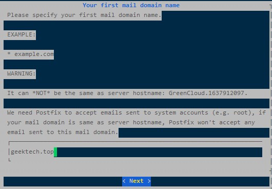 这里设置第一个发信域名。如果你的邮件服务器域名为 mail.geektech.top 那么这里可以设置为 geektech.top。点击回车确定以后进入下一步,输入密码,然后确定。(千万牢记,若你的域名为 domian.com, 则管理员邮箱地址为postmaster@domian.com)
