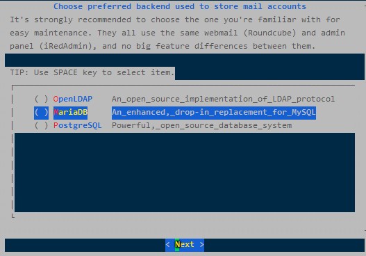 这里选择使用的数据库,可以选择比较简单的 MariaDB。用方向键选择MariaDB, 按空格键选中,然后回车进入下一步。