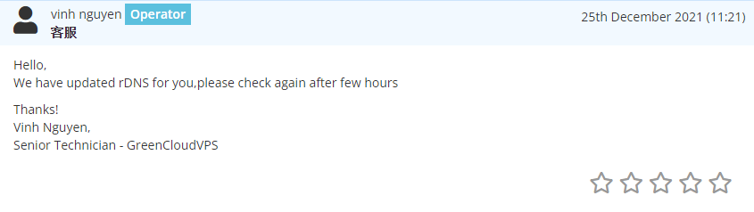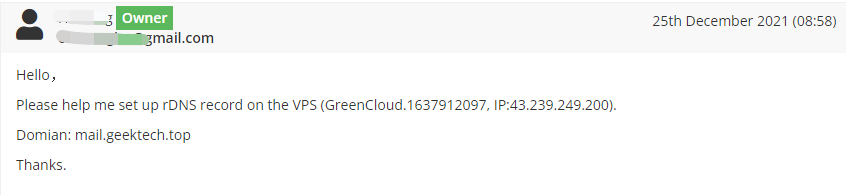 ⭐这里可以提前设置以下rDNS,具体的作用后面会讲到。本文是用 GreenCloud 家的VPS,设置 rDNS 需要发工单让客服帮忙设置。如果你是 Bandwagon Host(搬瓦工)家的 VPS,可以在 kiwi 面板里直接设置 rDNS。给绿云发如下的工单,客服就会帮你设置好 rDNS,附工单模板。